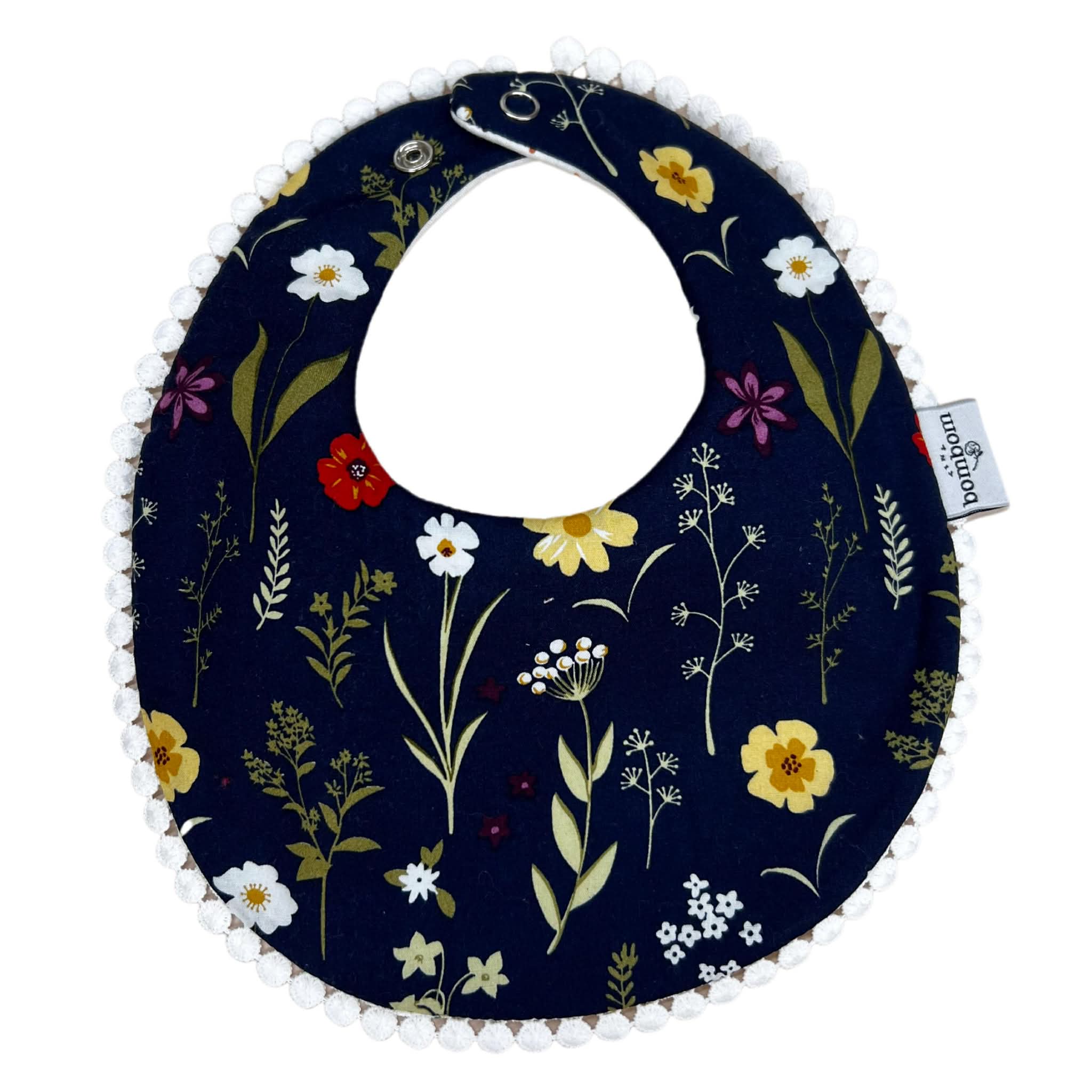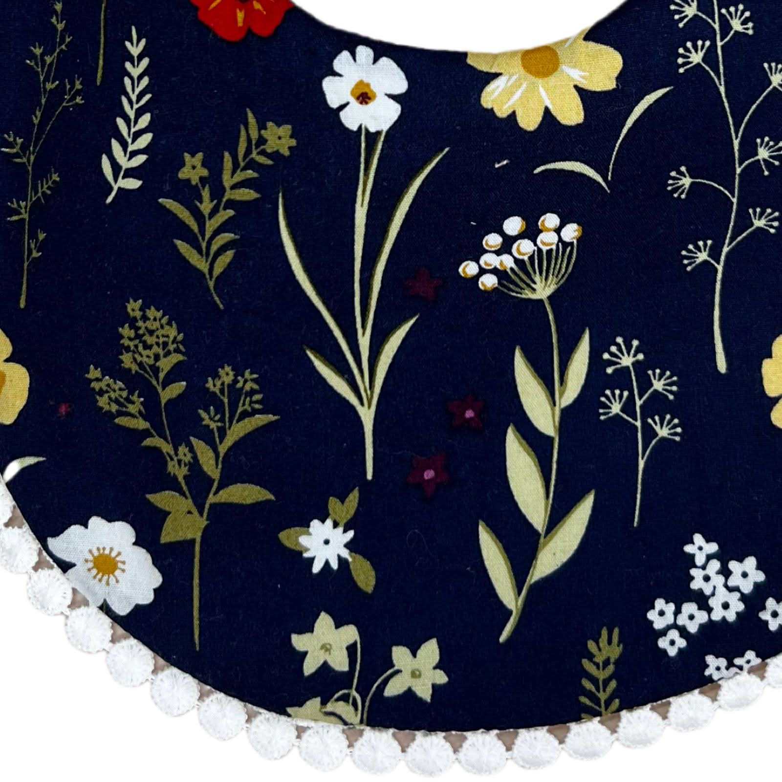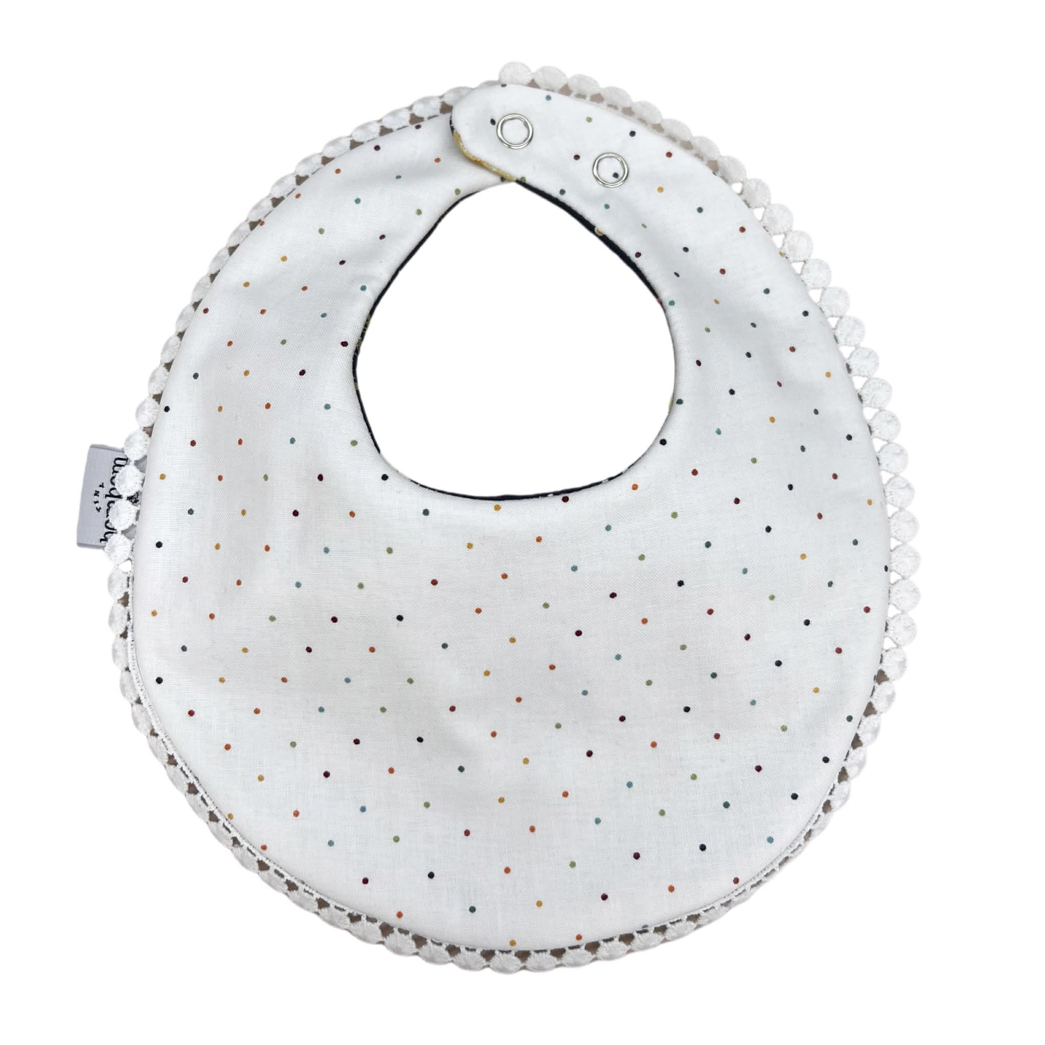 Babero doble vista, práctico y encantador. De un lado presenta un delicado estampado floral sobre fondo oscuro y del otro un diseño claro con pequeños puntos, perfecto para combinar con distintos outfits. Está confeccionado con tela suave y absorbente, ideal para proteger la ropa del bebé durante comidas y babitas. Cuenta con cierre de broche a presión para un ajuste cómodo y seguro, y un fino detalle decorativo en el borde que le da un toque especial.