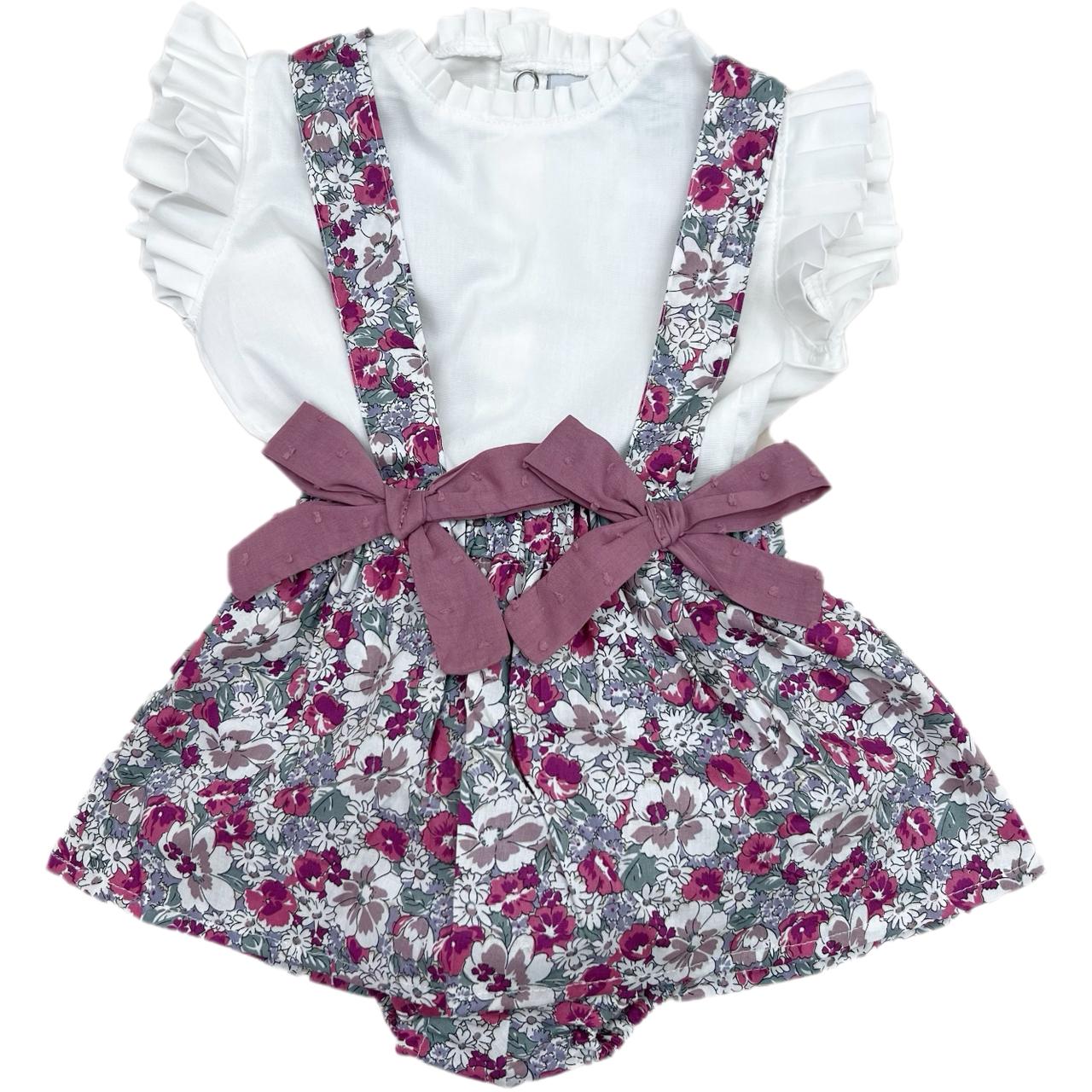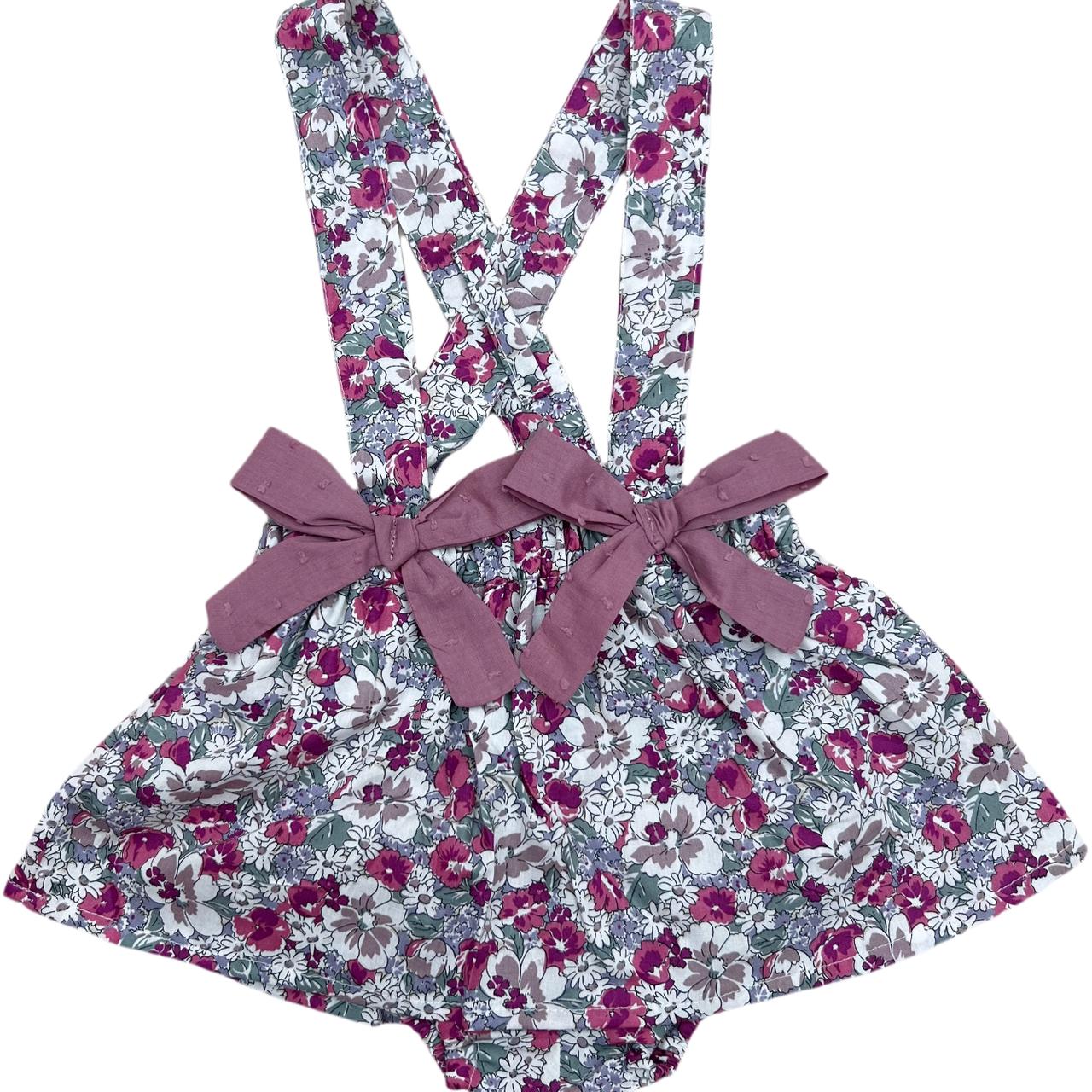 Falda con tirantes de tela de flores de suave para bebé con moñitos color rosa.