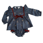 Jesusín para bebé niña de dos piezas, con vestido de manga larga y cubrepañal a juego. Diseño en tono azul con delicado estampado floral, olanes en los hombros y moño de terciopelo color vino al frente. Cómodo, suave y perfecto para cualquier ocasión.