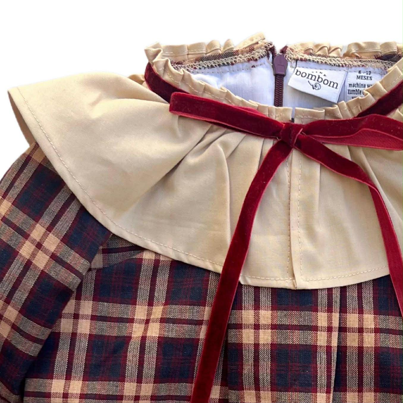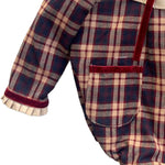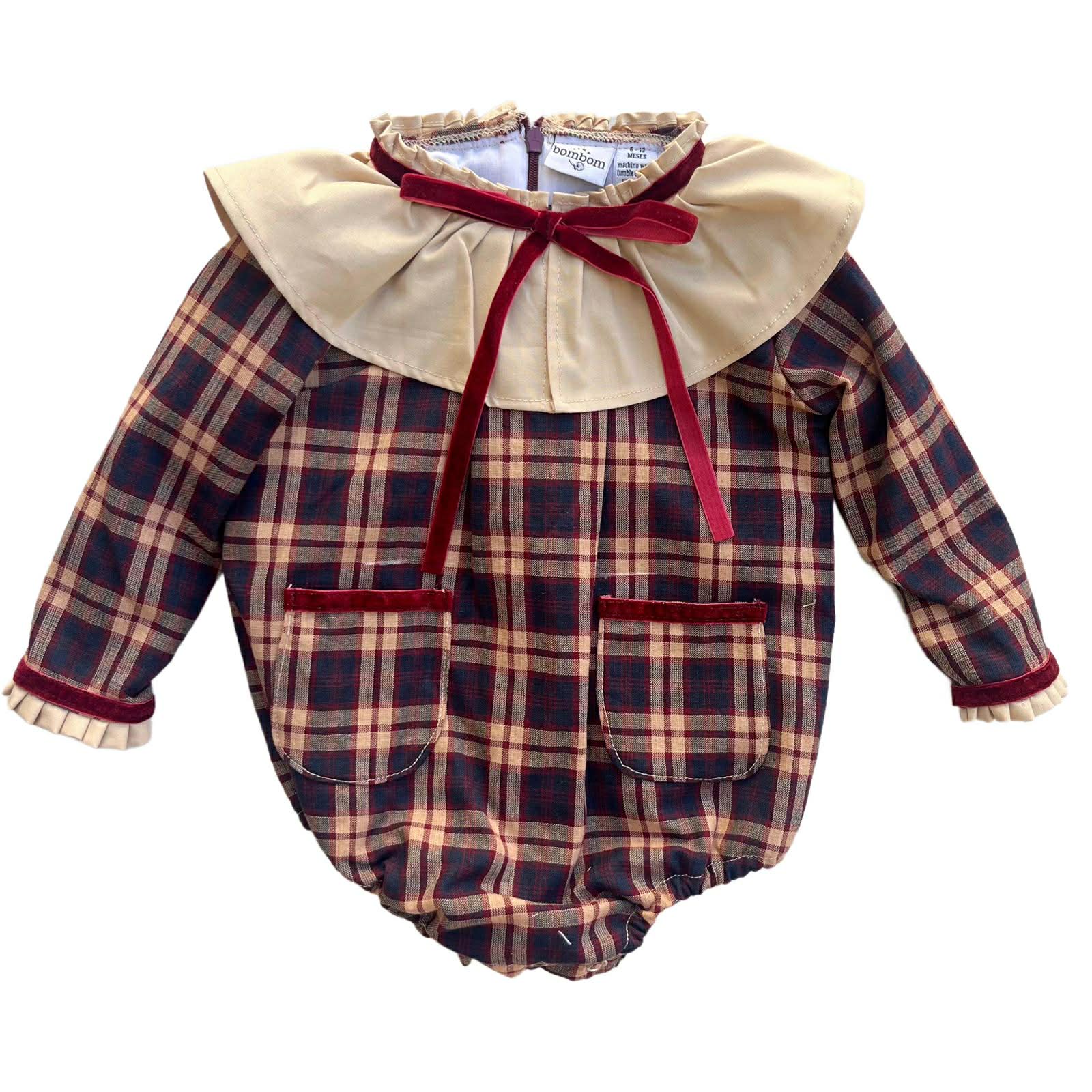 Ranita de niña confeccionado en tela de cuadros en tonos azul marino, beige y vino, con un diseño clásico y encantador. Incluye cuello babero amplio en color crema, adornado con un moño de terciopelo rojo que aporta un toque elegante. Lleva dos bolsitas frontales con ribete de terciopelo a juego y puños con detalle plisado que completan el look. De manga larga y con ajuste cómodo, es perfecto para lucir en ocasiones especiales o para un outfit invernal con estilo.