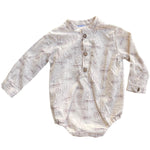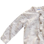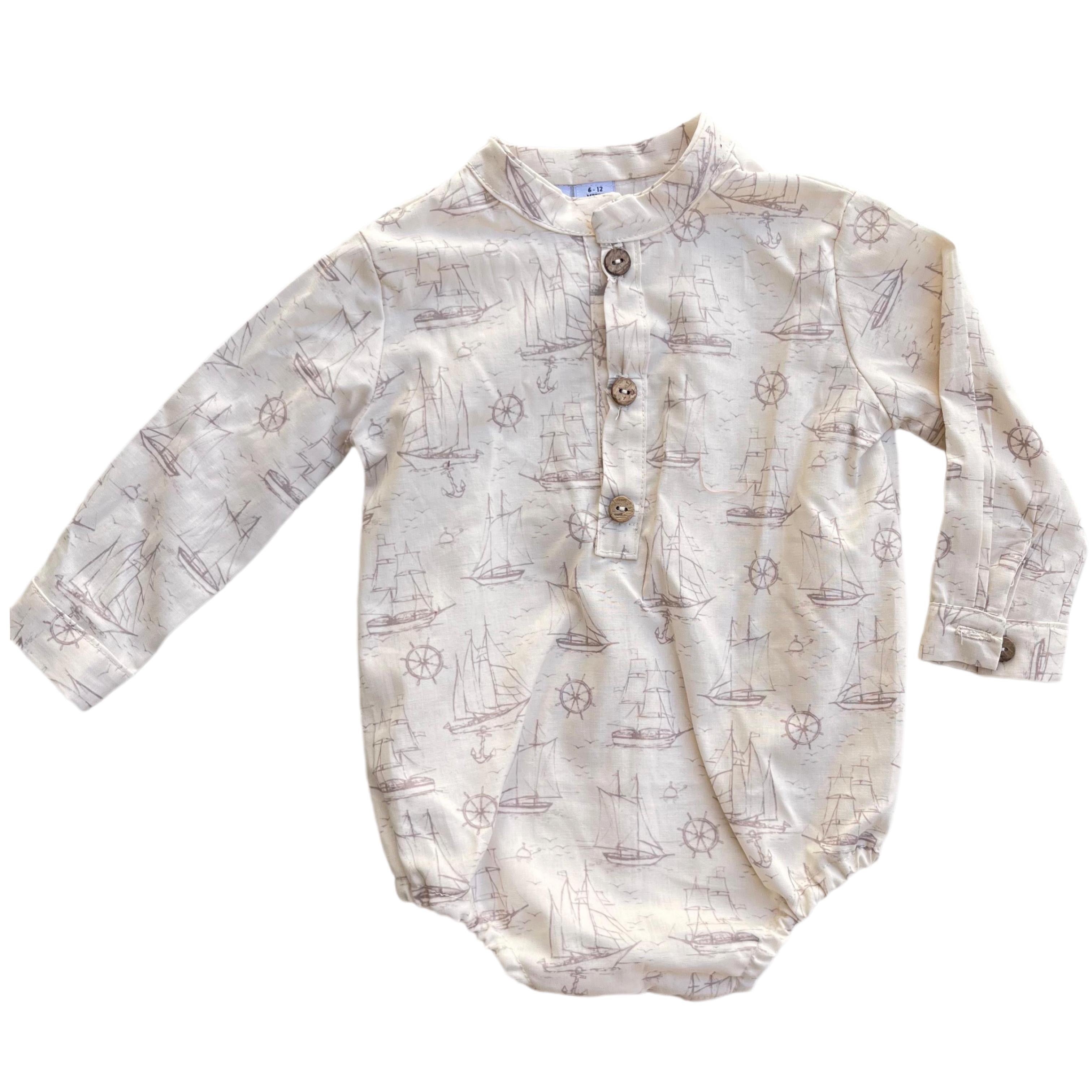 Body de manga larga confeccionado en tela suave y ligera, ideal para brindar comodidad durante todo el día. Presenta un delicado estampado náutico con barcos, timones y anclas en tonos neutros, perfecto para un look clásico y elegante. Cuenta con cuello mao y botonadura frontal con botones decorativos, que facilitan el cambio y le dan un estilo tipo camisa. La parte inferior con ajuste elástico permite un mejor acomodo y libertad de movimiento. Ideal para ocasiones especiales o para un outfit casual con estilo.
