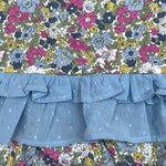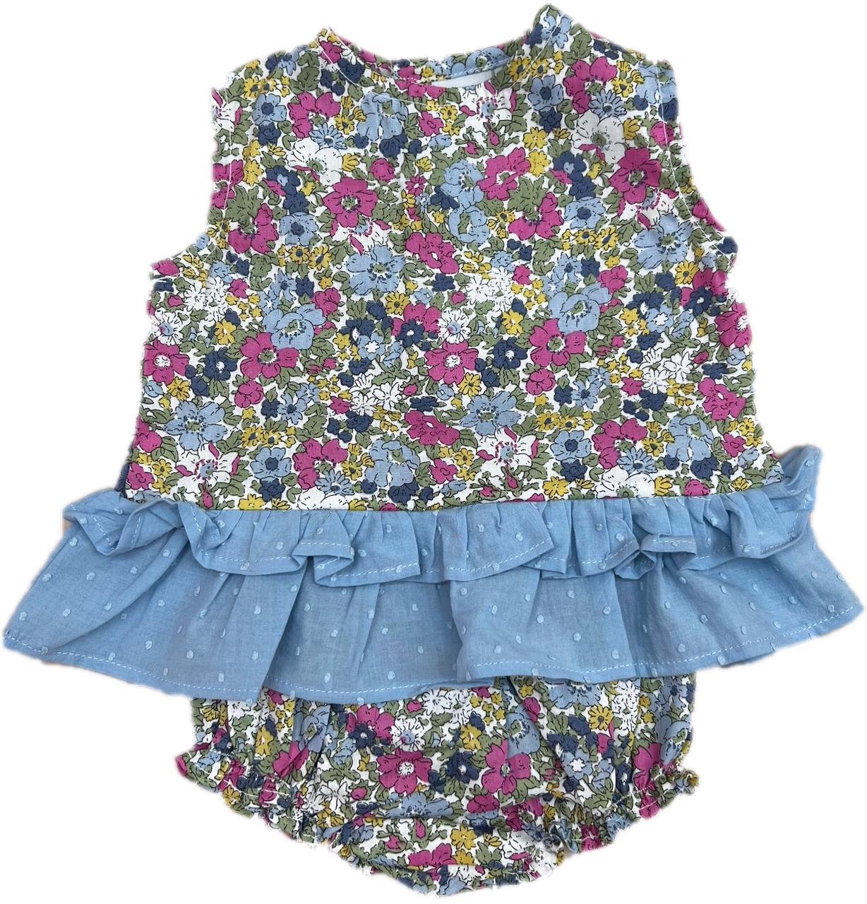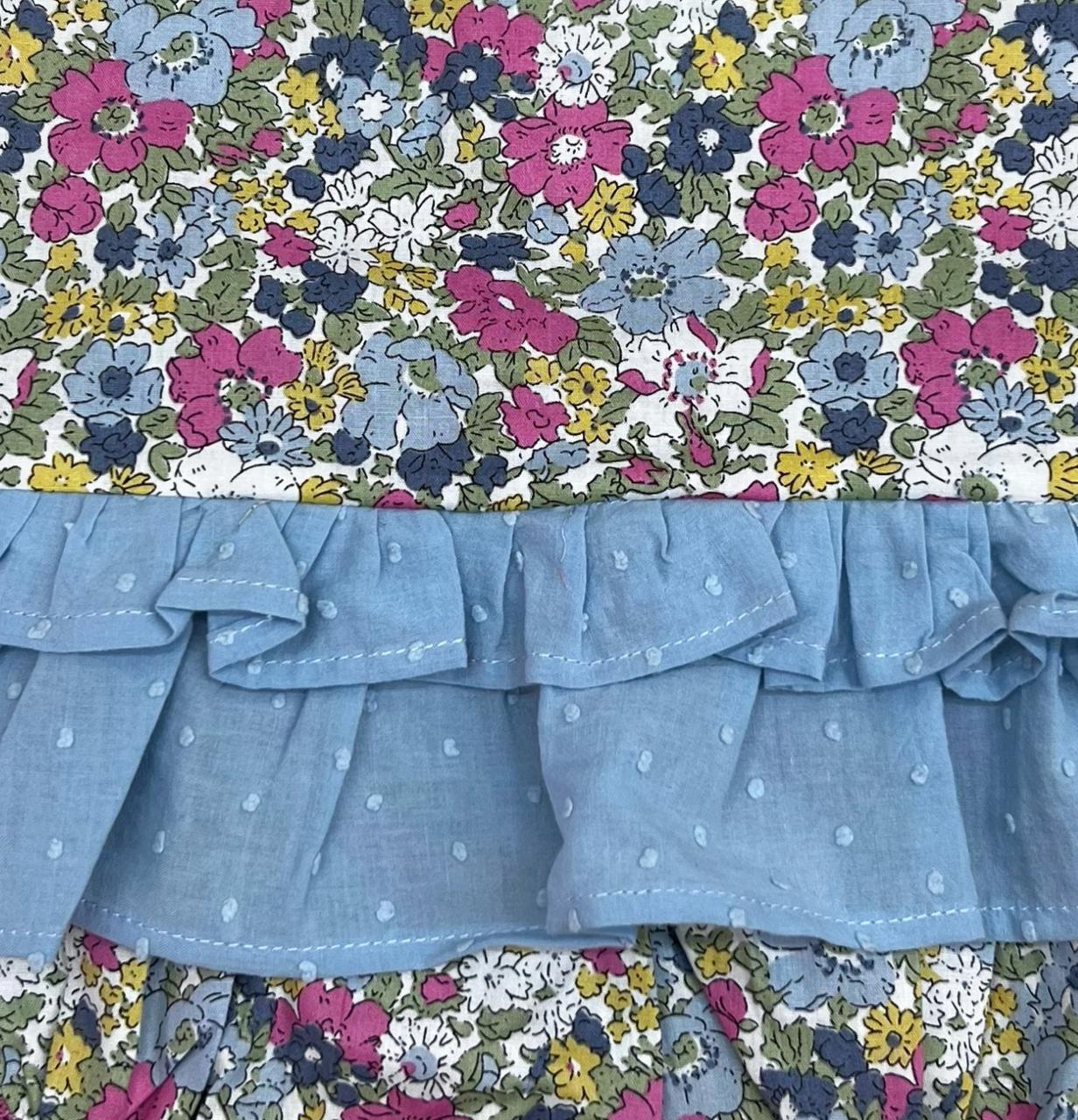 Jesusín con estampado floral en tonos vibrantes y detalle de volantes en tela azul.