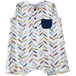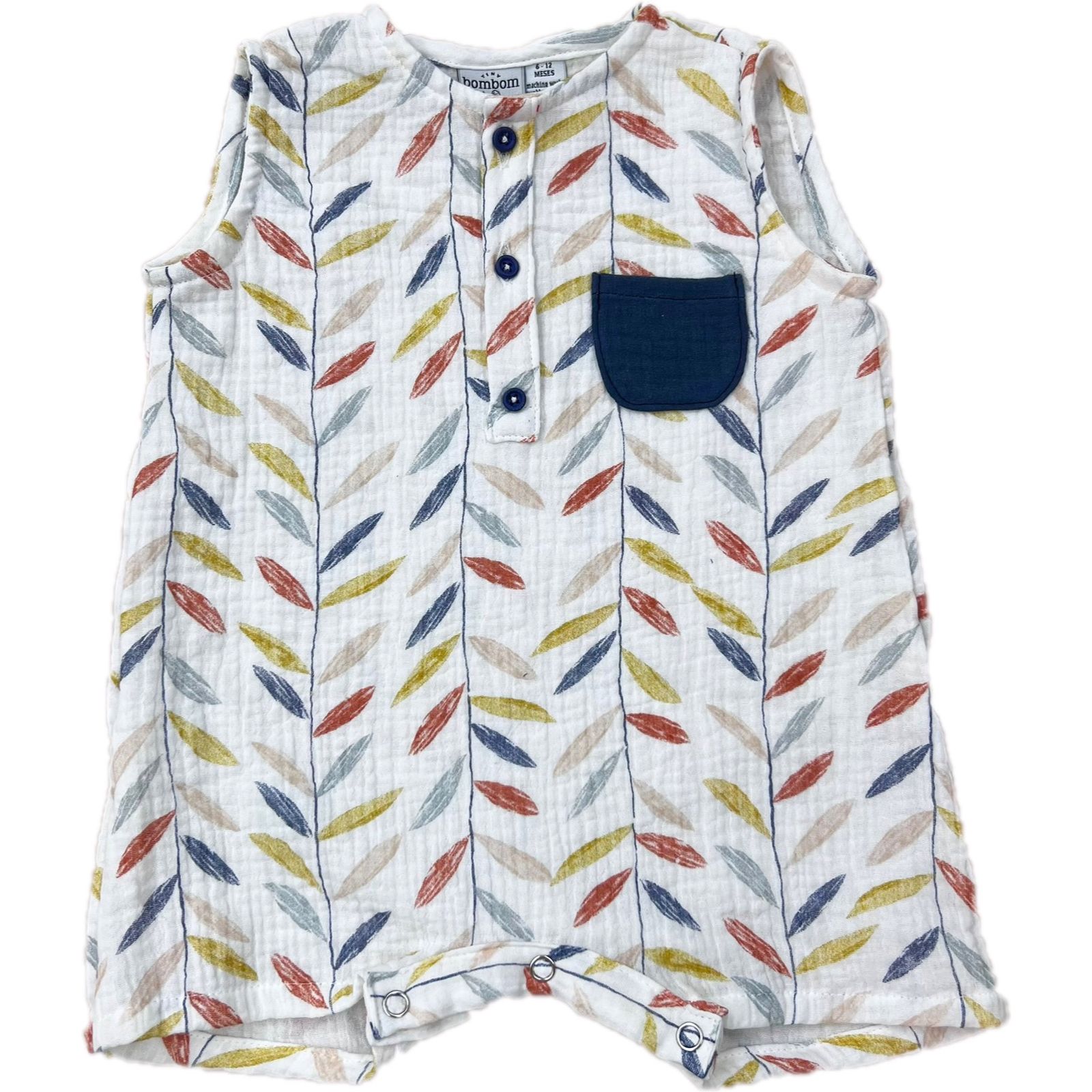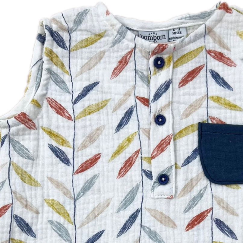 Overol de muselina con estampado de hojas en tonos suaves y bolsillo contrastante al frente. Confeccionado en tela ligera y cómoda para tu bebé