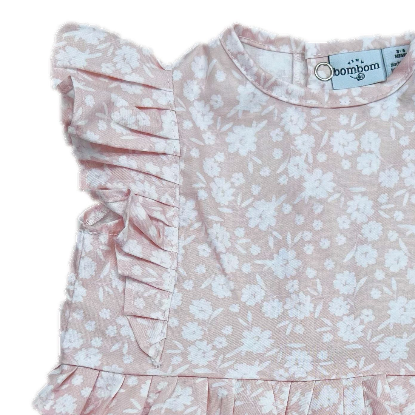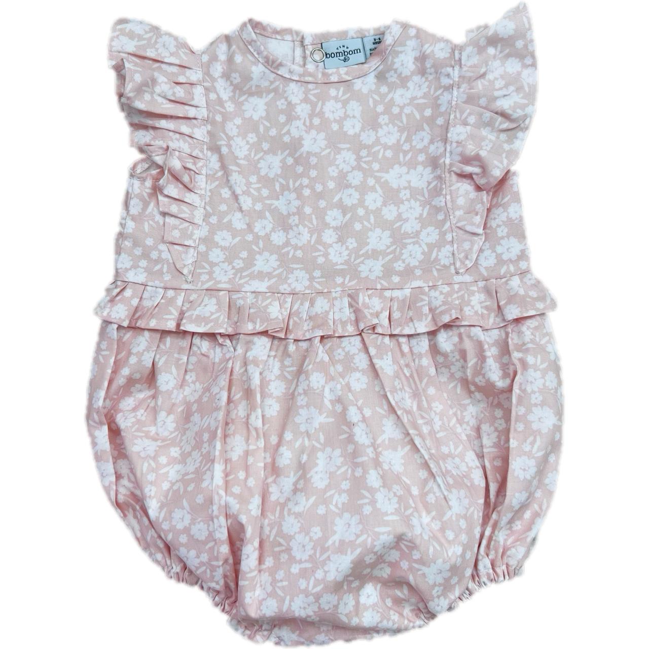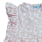Ranita con estampado floral en rosa y blanco y olanes del mismo print al frente.