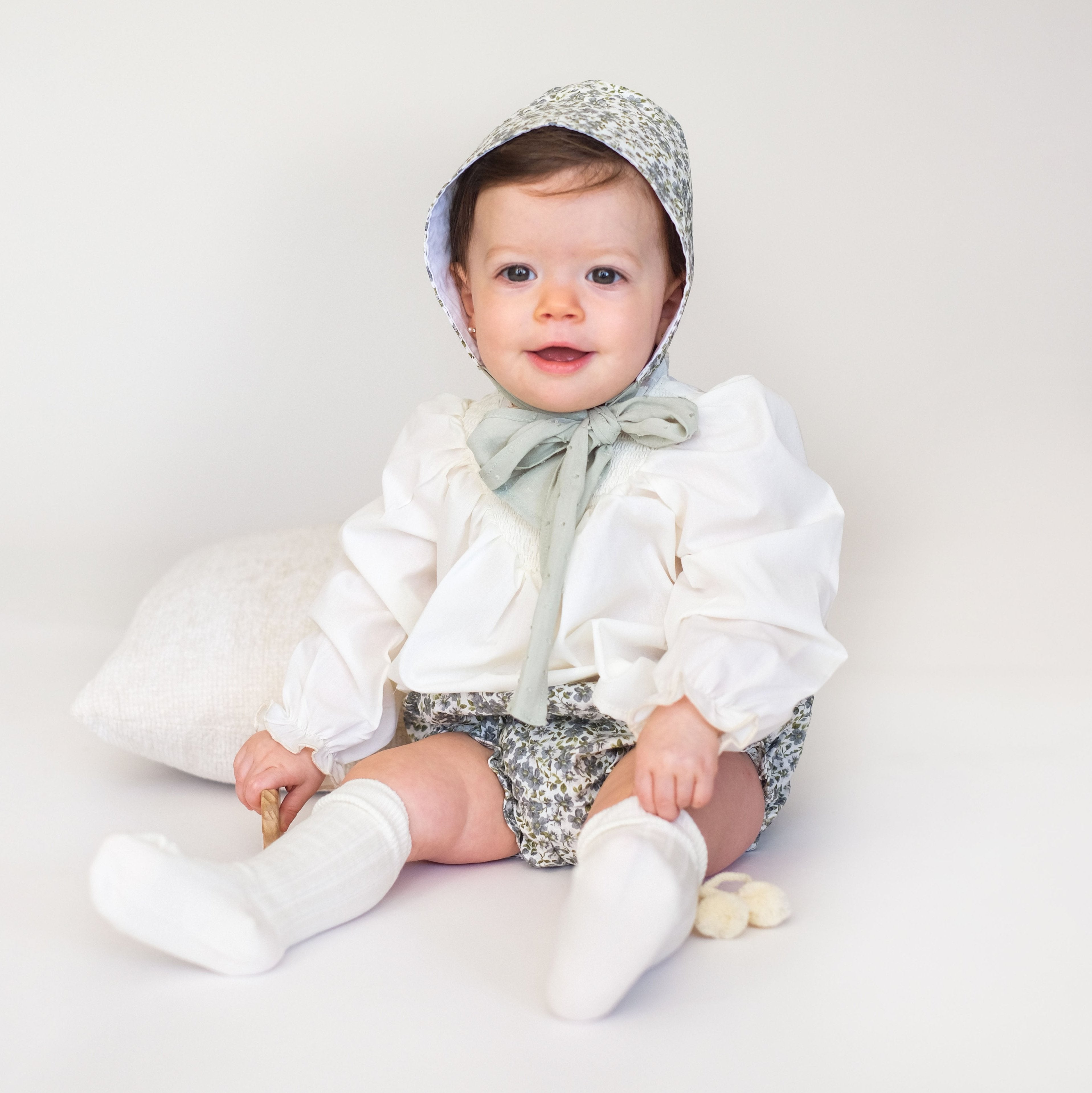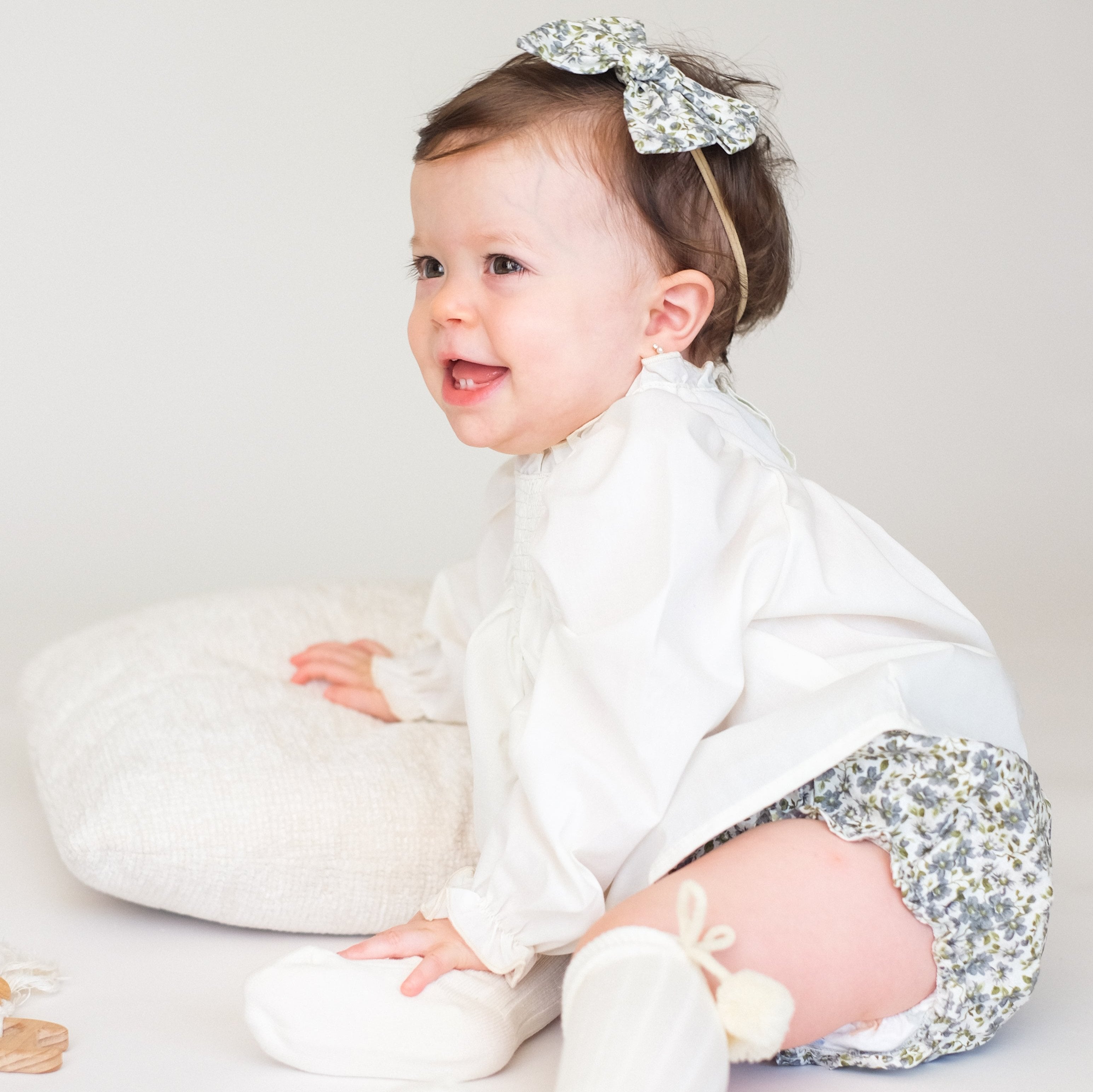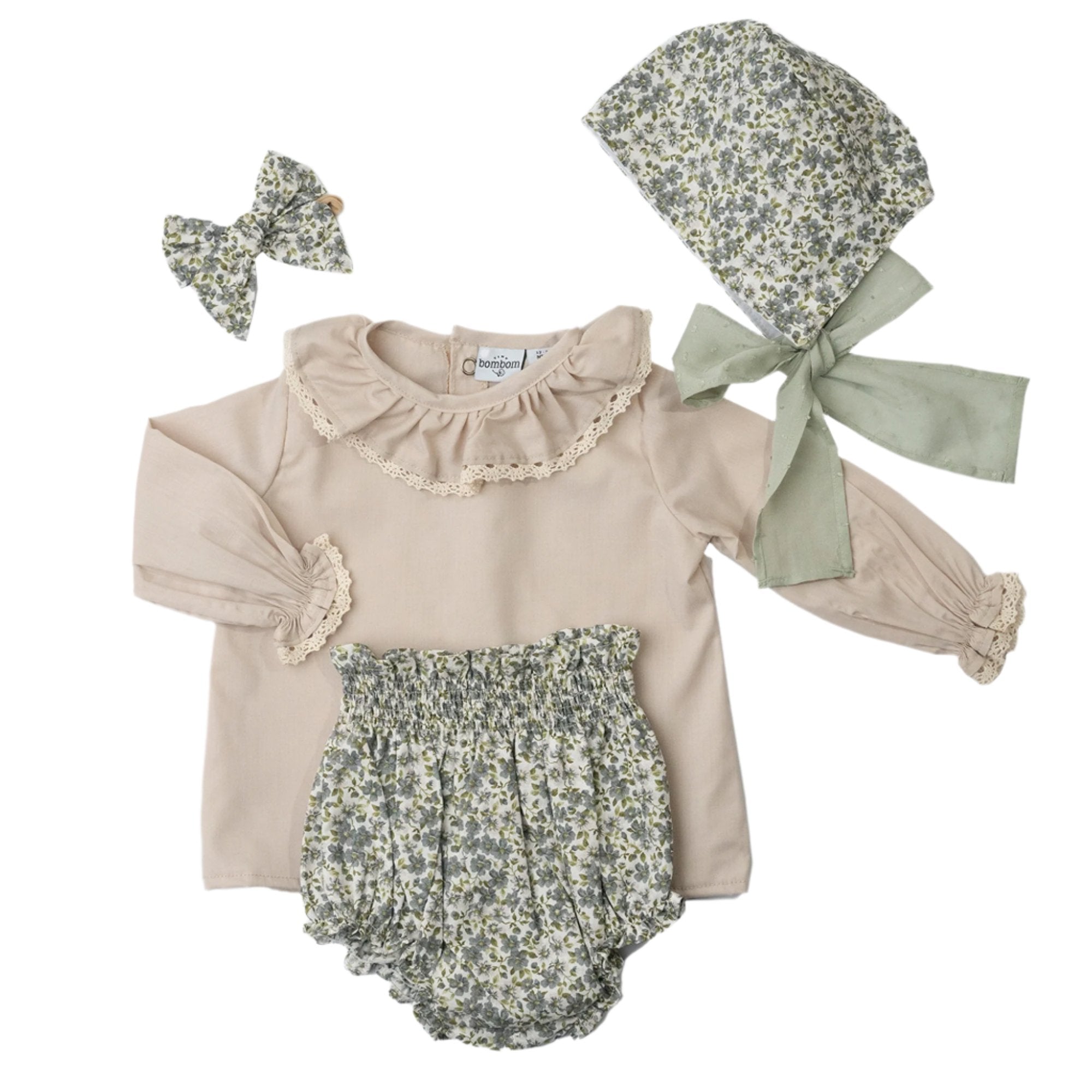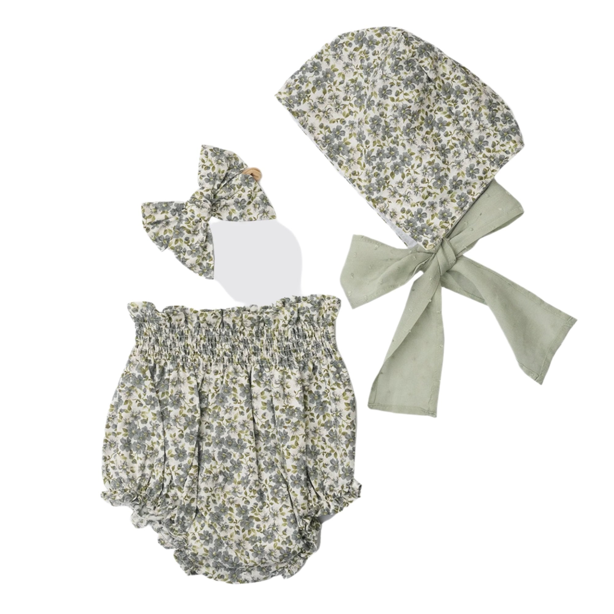 Set de 3 piezas conformado por capota, bloomer y tiara juego. En tela de Algodon suave y delicado lazo.