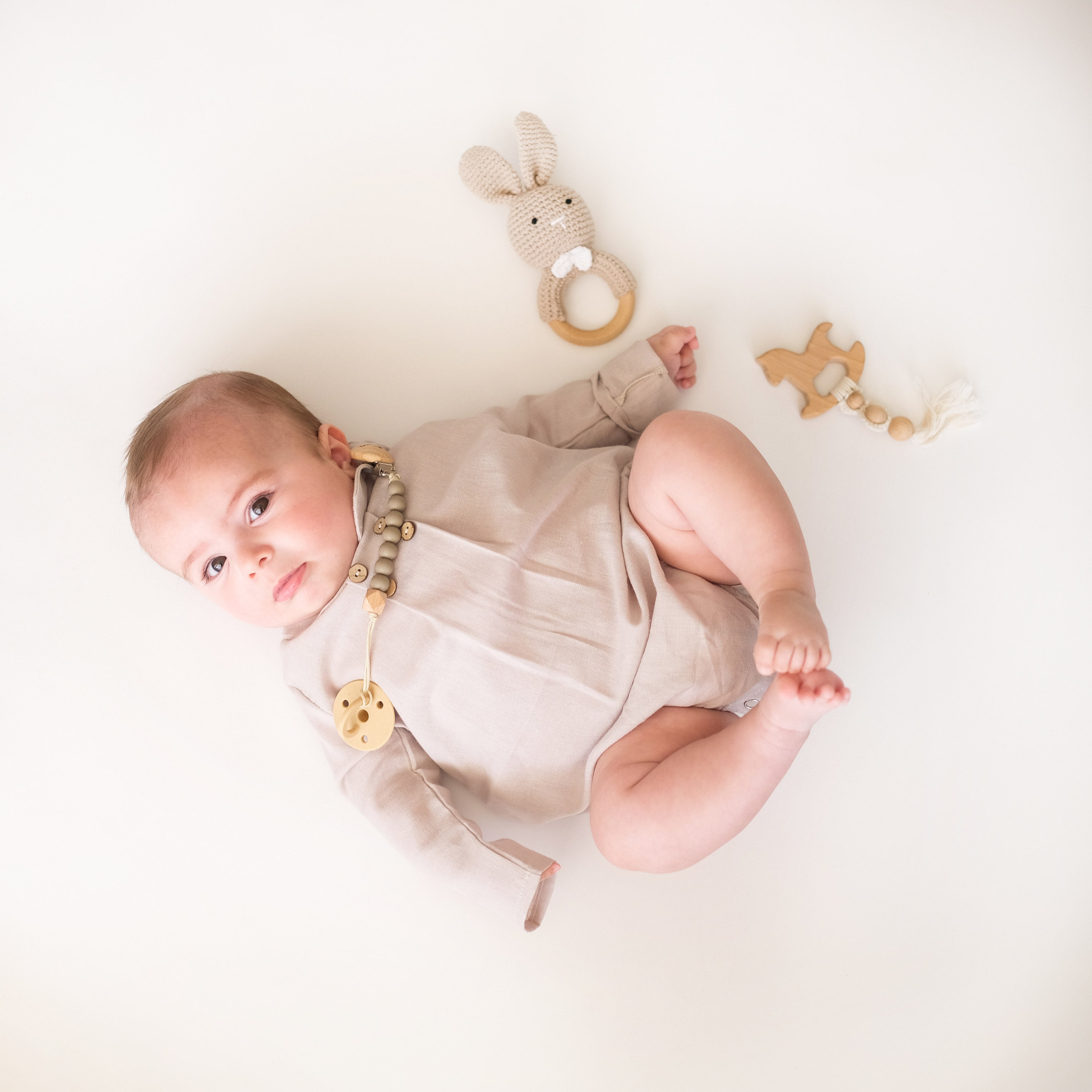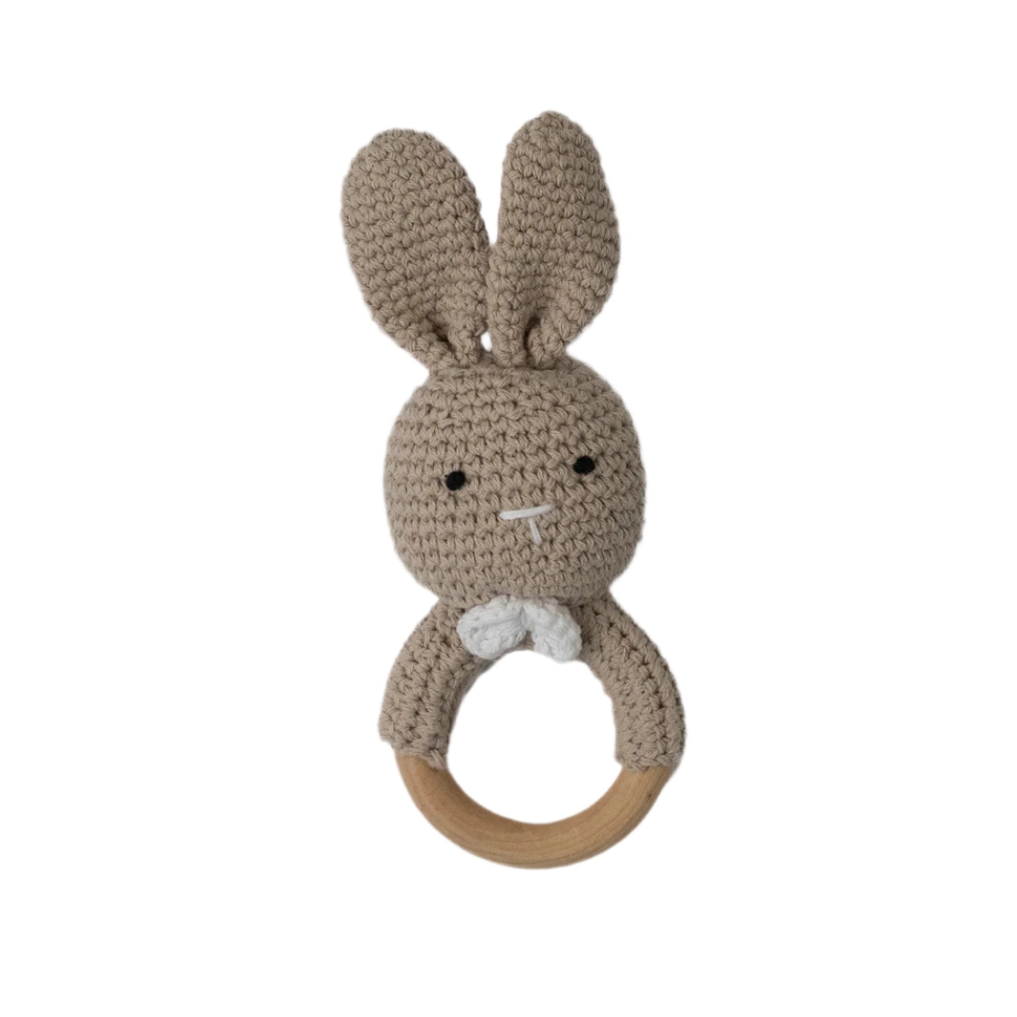 Sonaja tejida de algodón en forma de conejo, ideal para bebés. Su suave textura y diseño adorable ofrecen confort, mientras que los mordedores de madera proporcionan un alivio natural para las encías del bebé durante la etapa de dentición. Un accesorio tierno y funcional para el cuidado de tu pequeño.