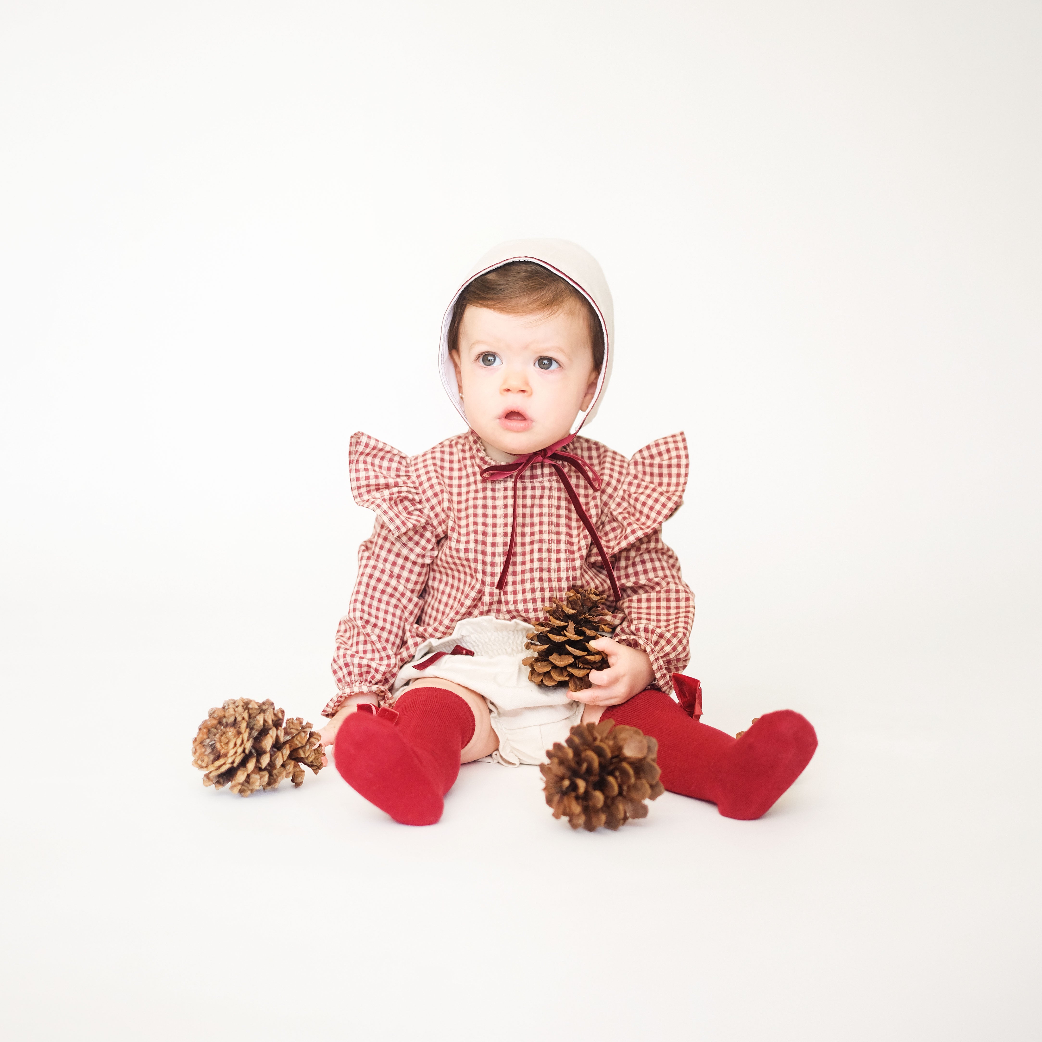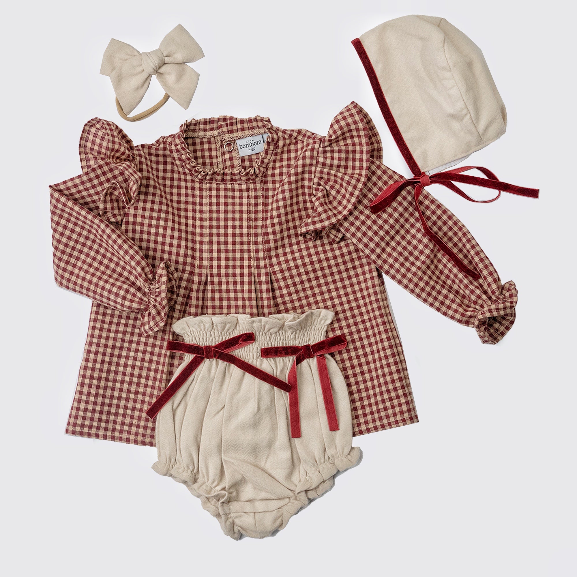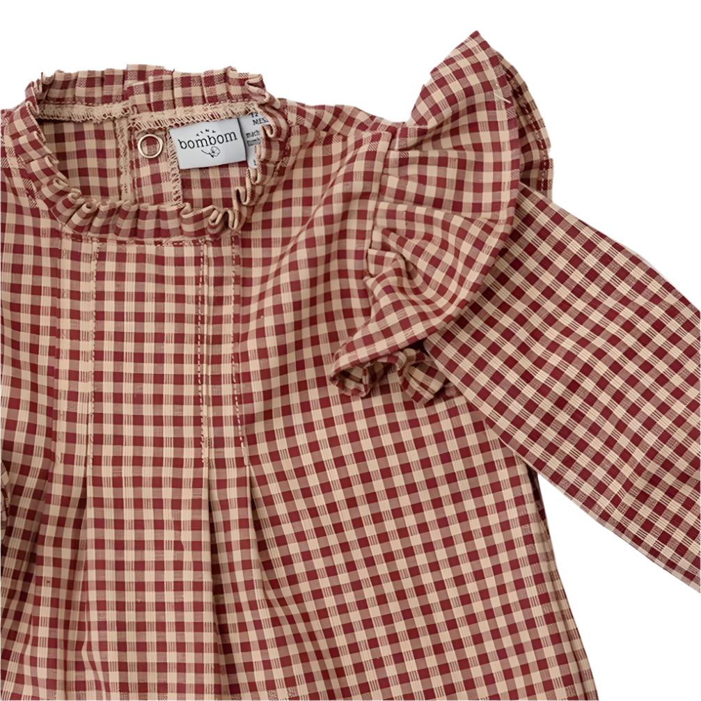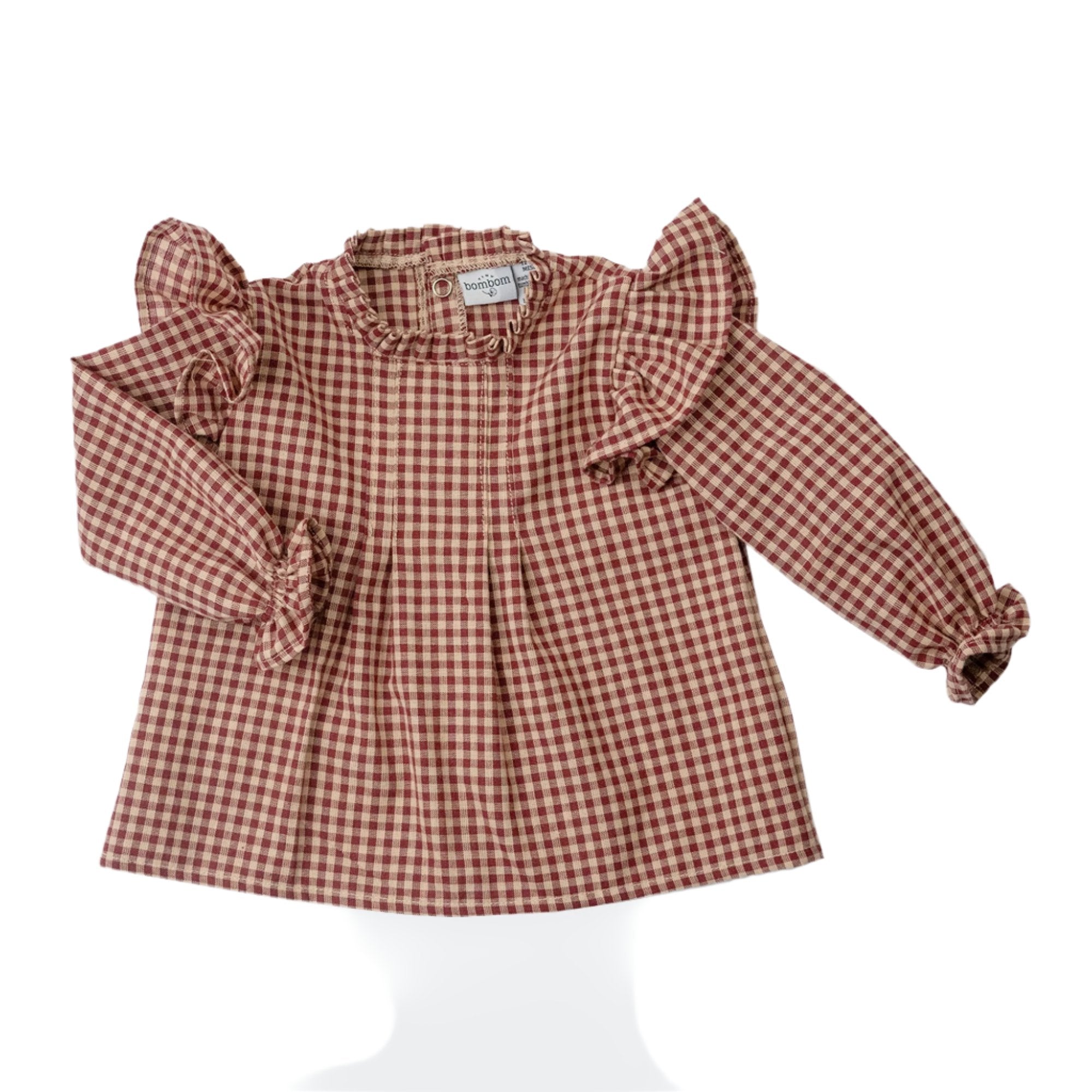 Blusita Vichy Beige y Vino con Olan en Hombros