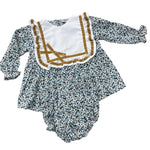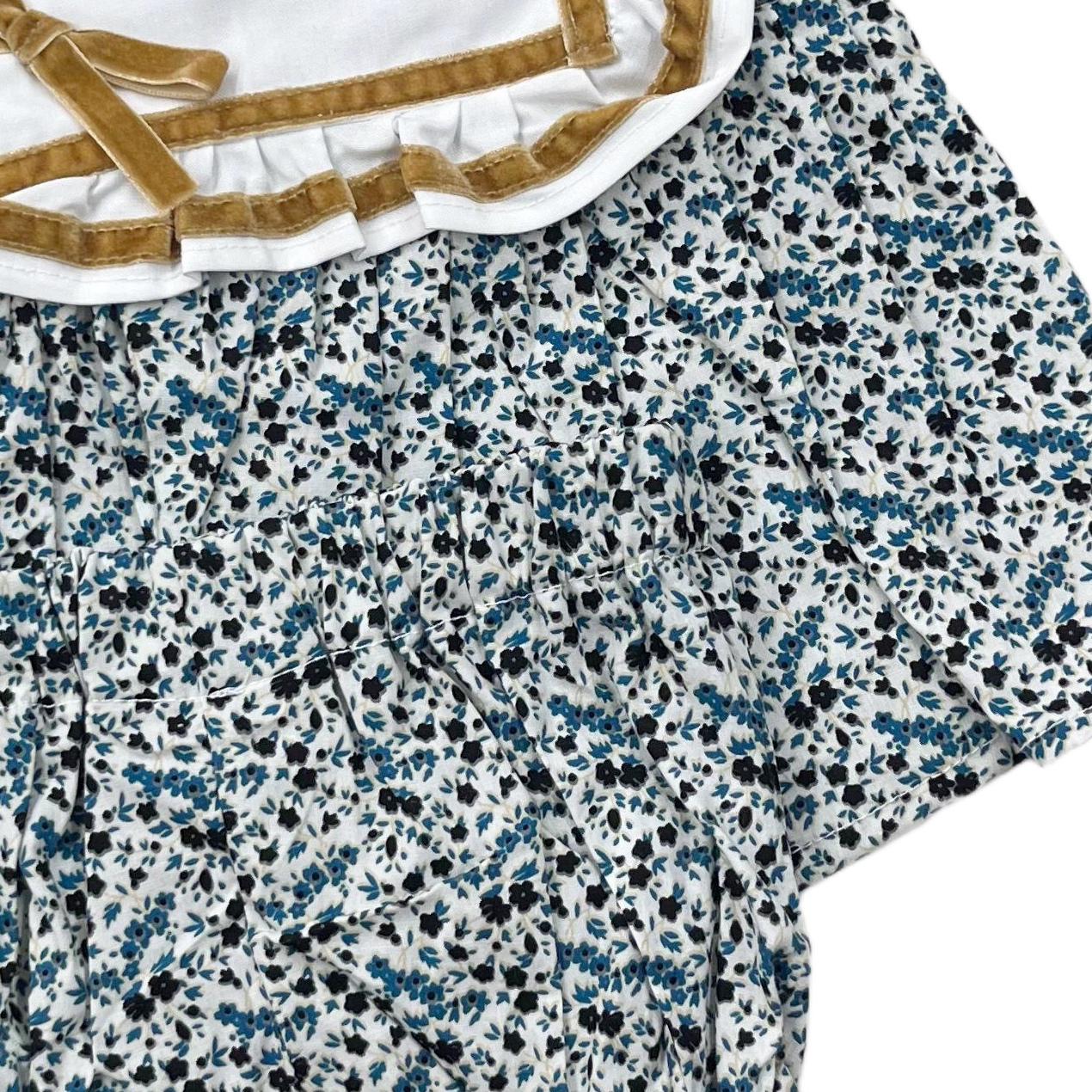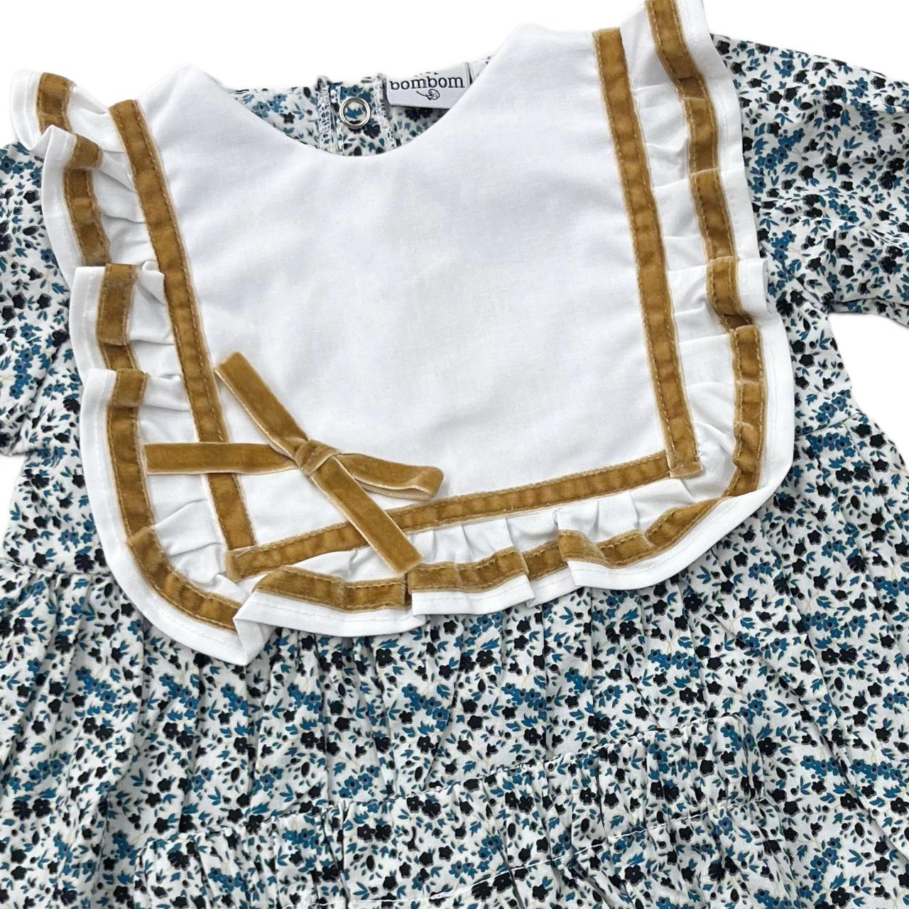 Jesusín con estampado floral en tonos azul y beige, confeccionado en algodón suave y ligero. Destaca por su delicado cuello blanco tipo babero adornado con ribetes y lazo de terciopelo color mostaza. Incluye braguita a juego, creando un conjunto encantador y cómodo para tu bebé. Ideal para lucir en cualquier ocasión especial de la temporada.