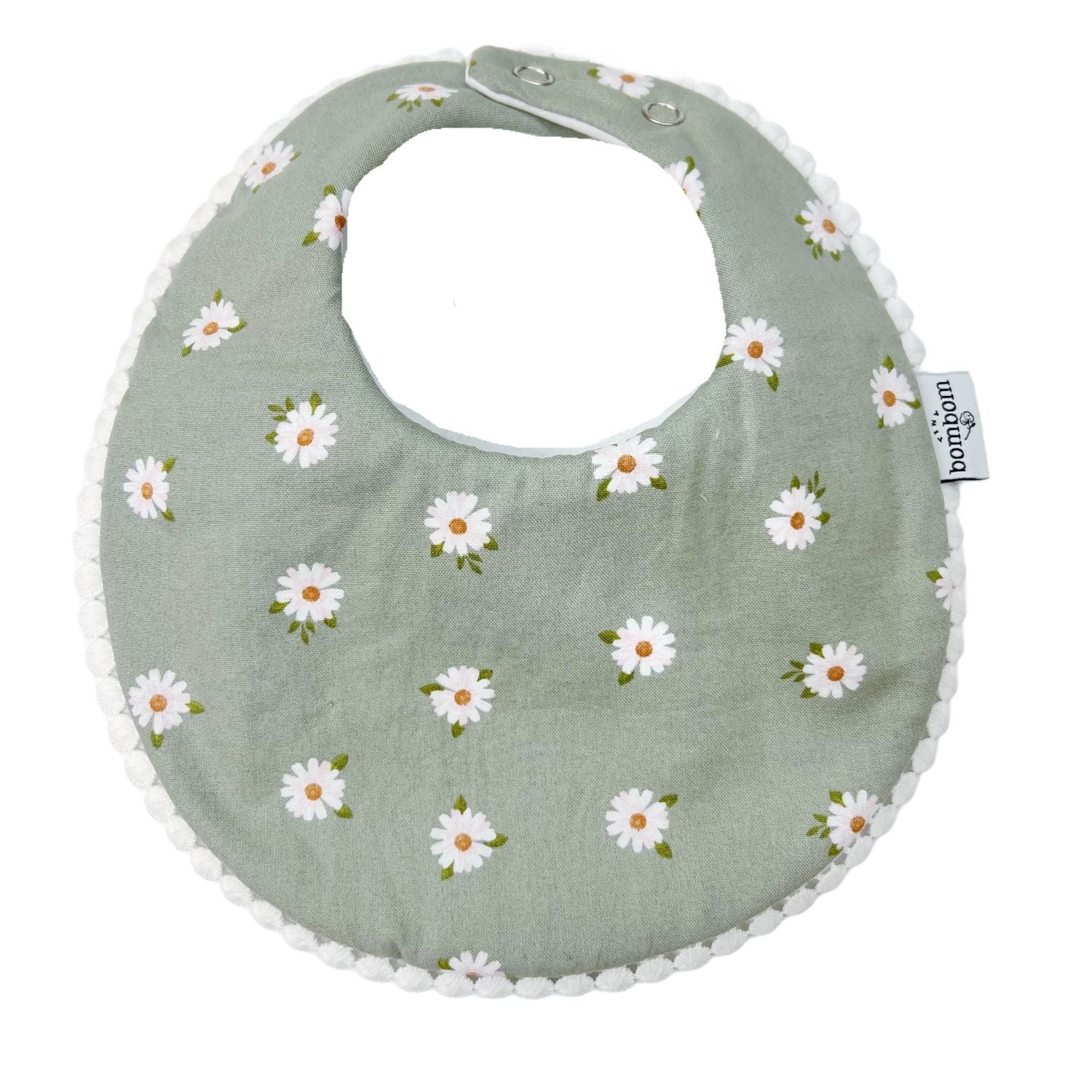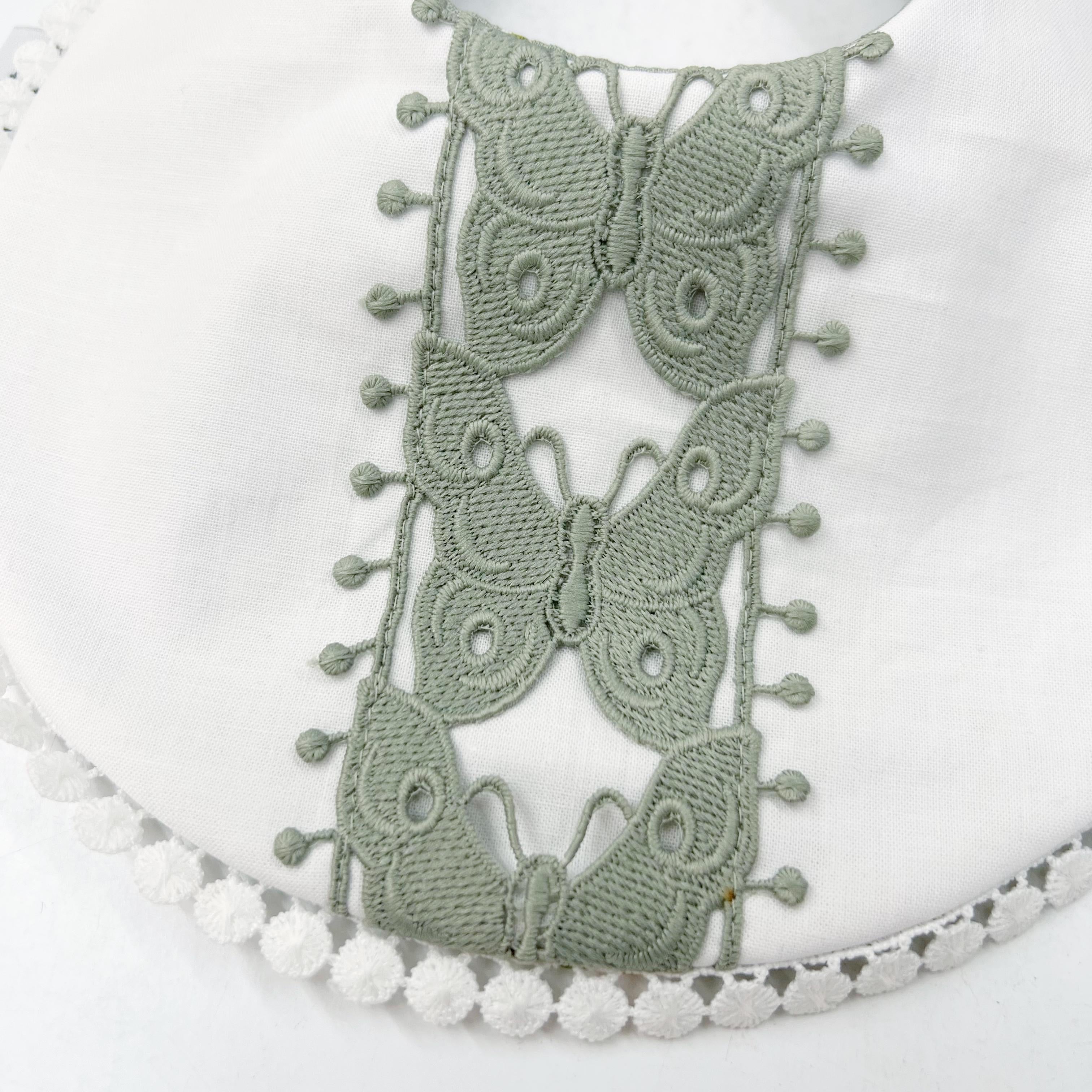 Babero confeccionado en tela suave y ligera, ideal para la piel delicada del bebé. Presenta un delicado estampado de margaritas sobre fondo verde suave, con acabado de encaje blanco alrededor y reversible verde con encaje de mariposa que le da un toque elegante y tierno. Cuenta con broche a presión en la parte superior para un ajuste cómodo y seguro.