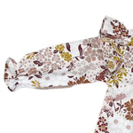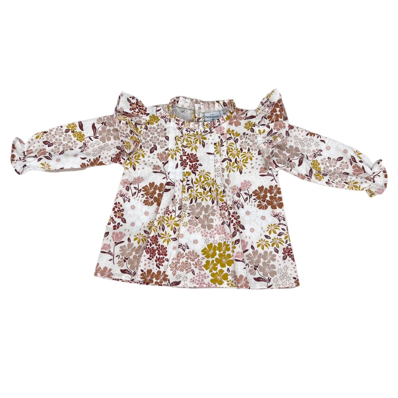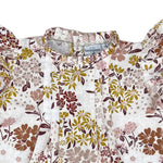 Blusa estampada floral para niña, confeccionada en una tela ligera y suave ideal para el día a día. Presenta un diseño de manga larga con puñitos fruncidos y delicados volantes en los hombros que añaden un toque coqueto. Su estampado floral en tonos tierra, mostaza y rosados le da un estilo otoñal y muy dulce. Cuenta con pequeños pliegues al frente que le dan caída y amplitud