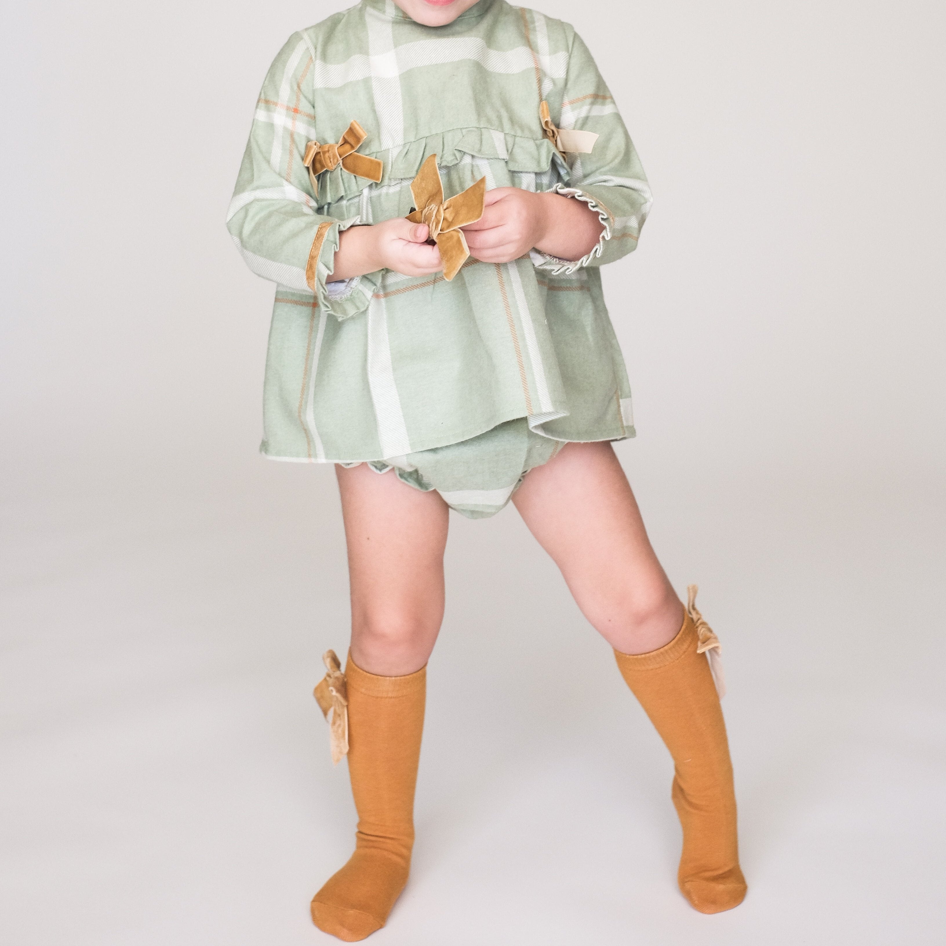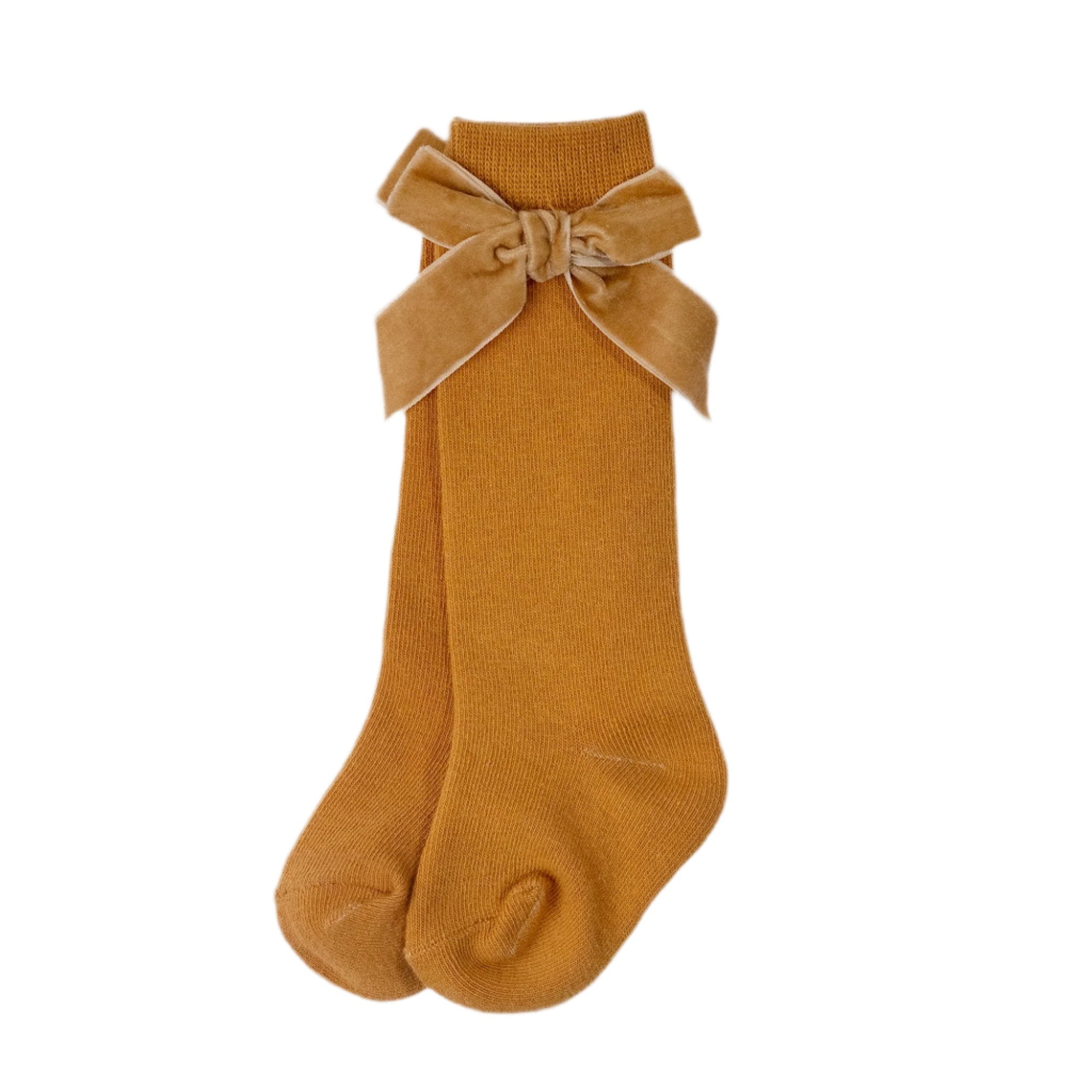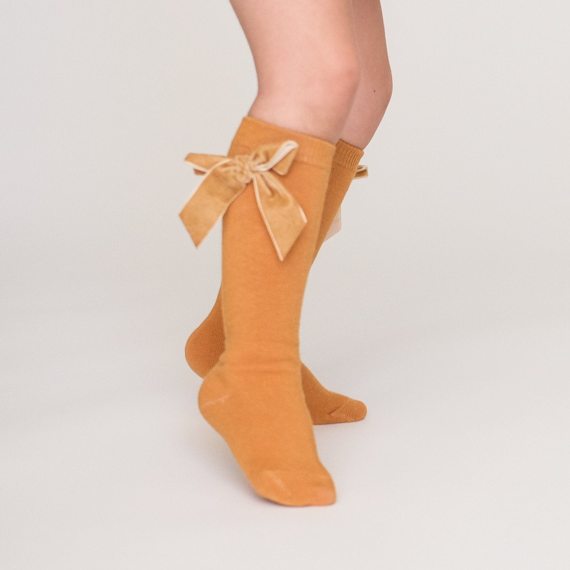 Calceta alta confeccionada en suave material que ofrece comodidad durante todo el día. Con un delicado moño de terciopelo, aportando un toque elegante y sofisticado. Ideal para ocasiones especiales o para un look encantador en el día a día.