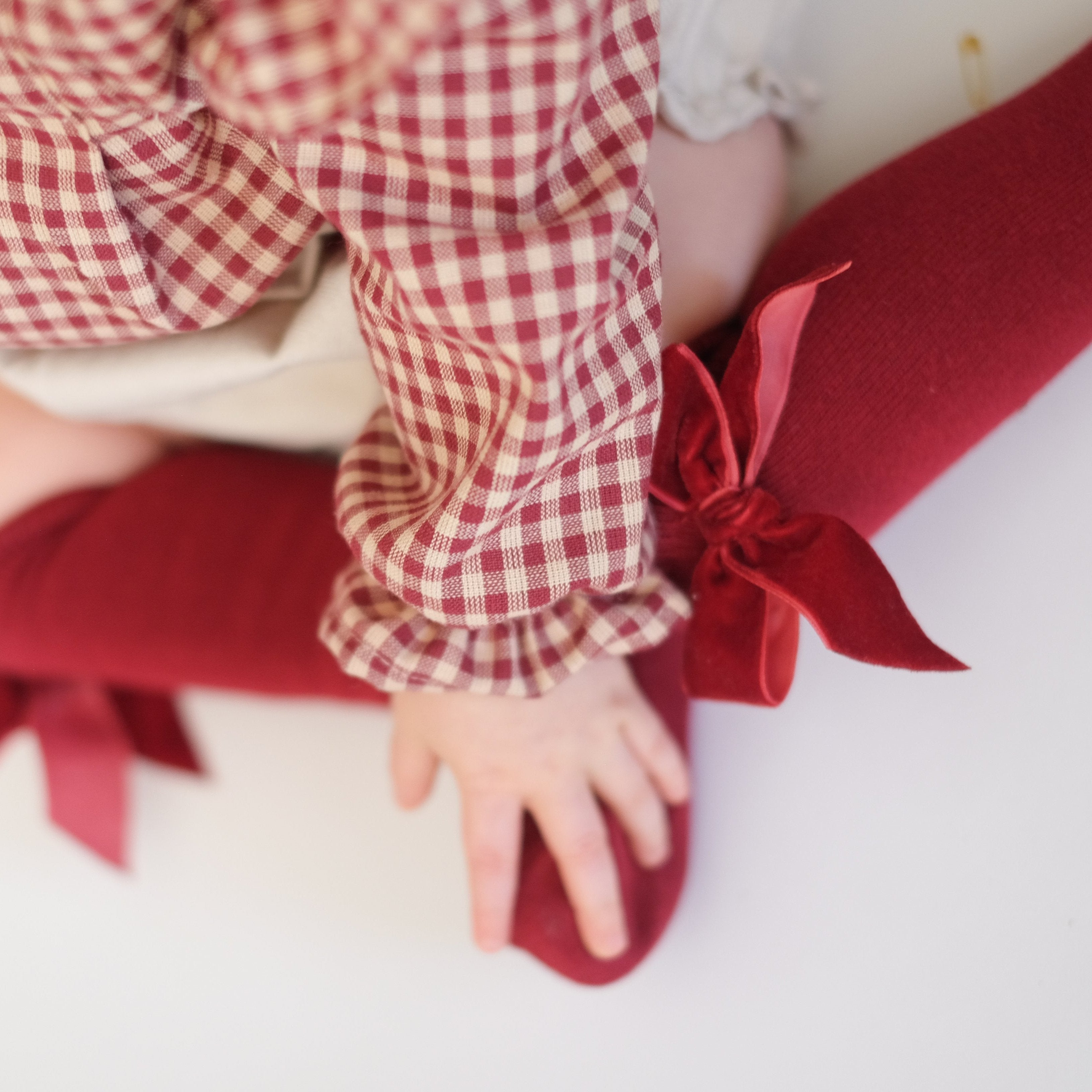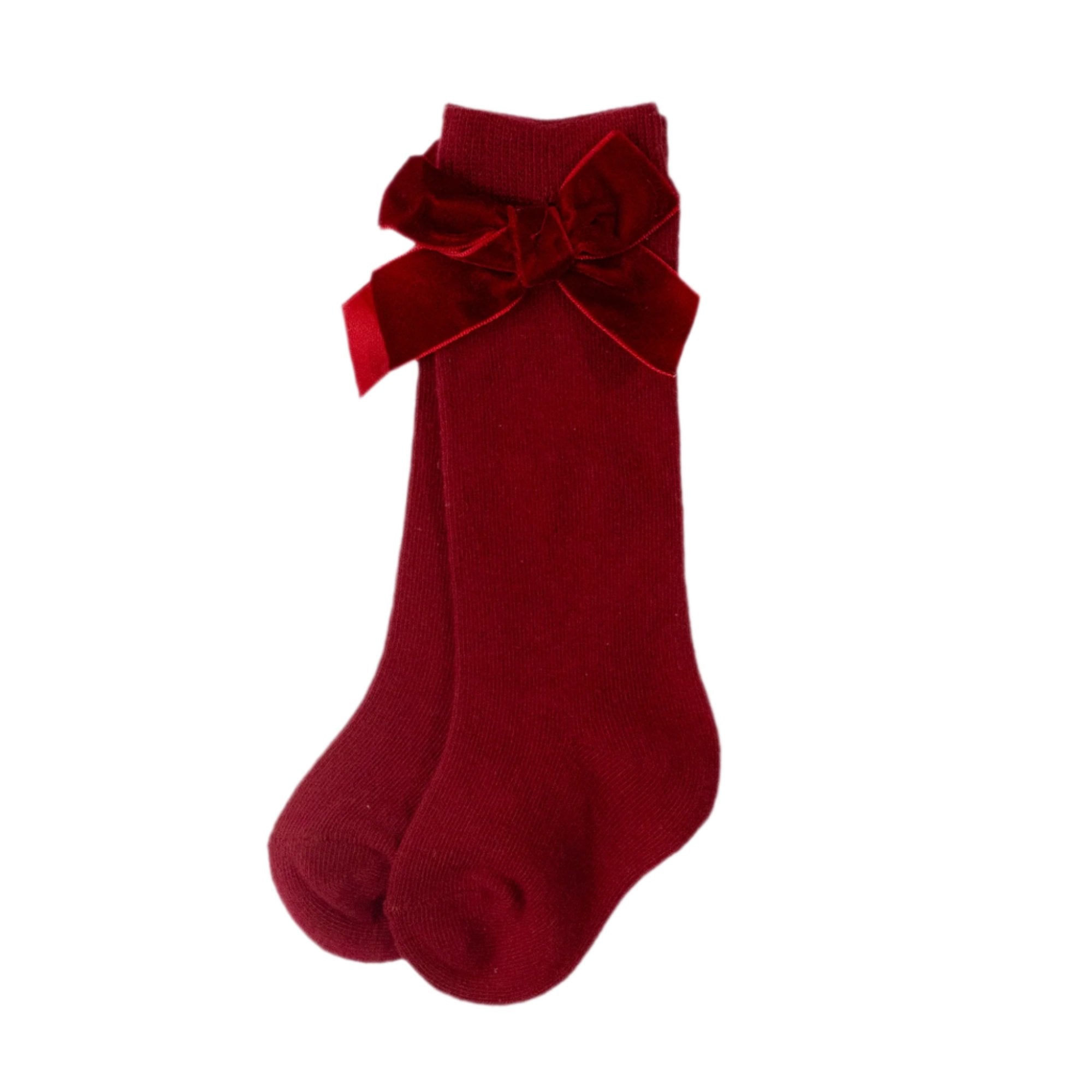 Calceta alta confeccionada en suave material que ofrece comodidad durante todo el día. Con un delicado moño de terciopelo, aportando un toque elegante y sofisticado. Ideal para ocasiones especiales o para un look encantador en el día a día.