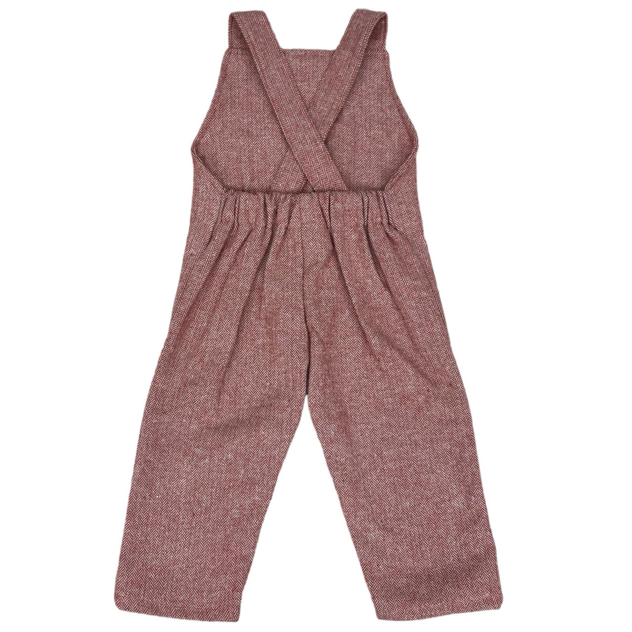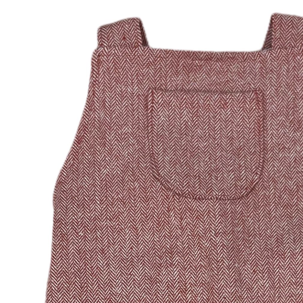 Overol para bebé en tejido de espiga color vino, con bolsillo frontal y tirantes anchos. Su diseño cómodo y versátil permite combinarla fácilmente con blusas o camisetas para crear looks adorables y prácticos. Ideal para cualquier ocasión durante la temporada otoñal o invernal.