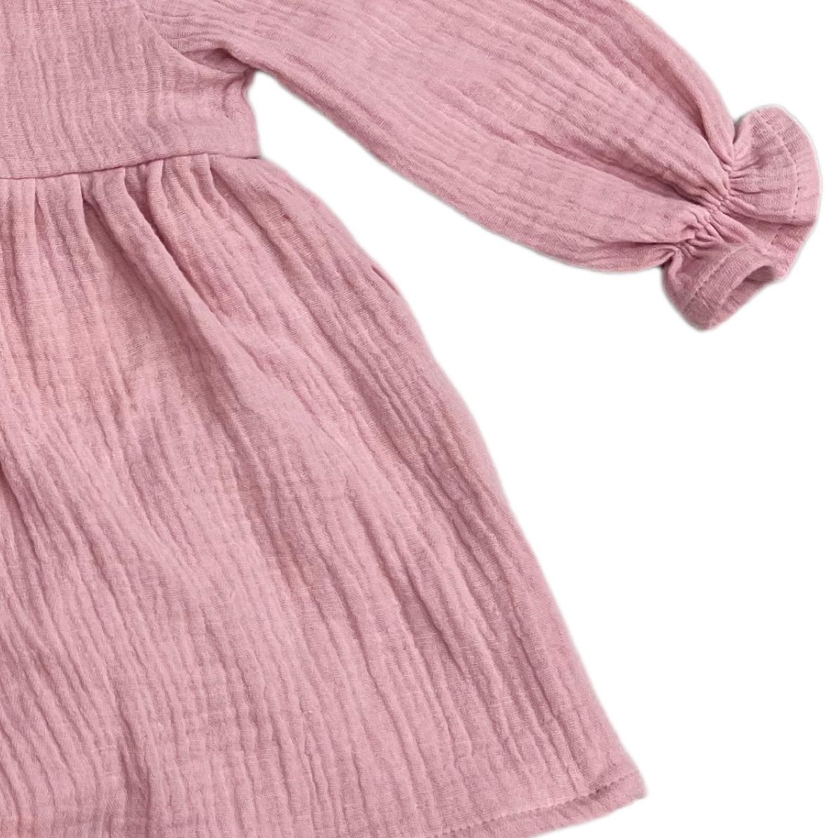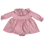 Ranita con falda para bebé confeccionado en suave muselina de algodón color rosa viejo. Presenta un delicado cuello volante y mangas largas con terminación fruncida, aportando un toque clásico y encantador. Lleva botones a presión en la parte inferior para facilitar el cambio. Una prenda cómoda, ligera y perfecta para cualquier ocasión.