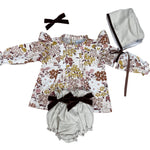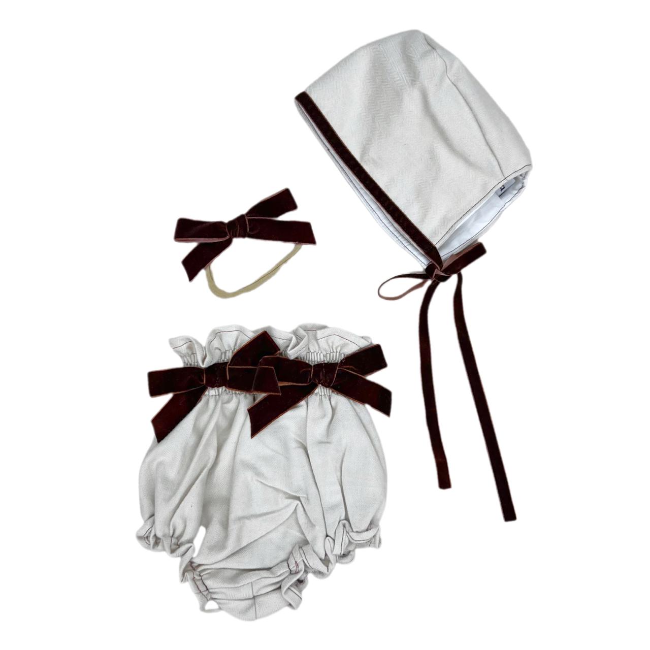 Set de 3 piezas conformado por capota, bloomer y tiara juego. En tela de Algodón suave y delicado terciopelo color vino.